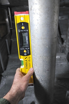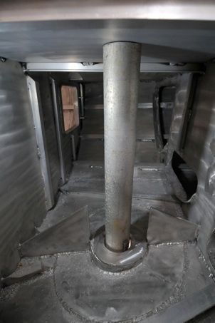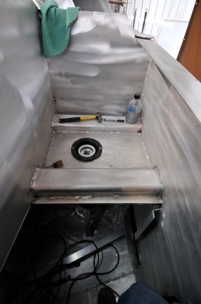 The inside welds were completed, making the platform waterproof inside, then the top plate was welded, and ground flush. Grinding in the lazarette is unpleasant, to say the least. Next , to determine the location of the upper bearing, I used a lightweight piece of 4-1/2” /114mm OD pipe , which is 1mm smaller than the rudder shaft, to project the shaft onto the underside of the cockpit sole. Again, having the entire boat hull level from side to side and fore/aft makes this technique possible. I cut the upper bearing hole with the plasma cutter using a hardboard template. This hole must be very close tolerance, as the flange screw holes are very close ( too close, actually) to the inner edge. Jefa should make the flange 6mm larger. I installed a 5mm doubler plate on the underside, then drilled the holes.