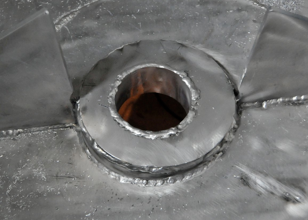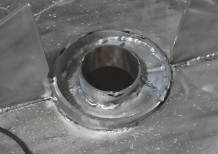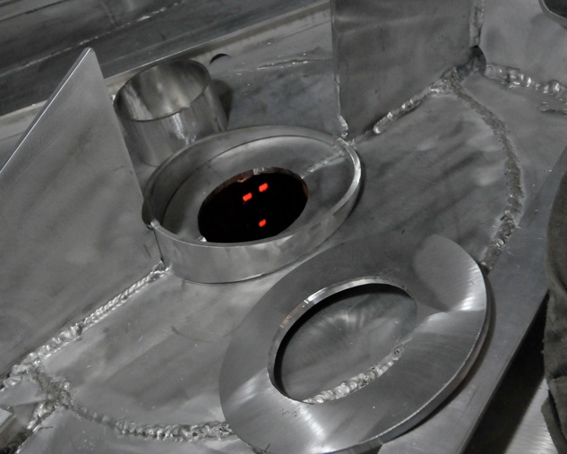 The parts of the rudder bearing leveling platform include and angled outer collar, a 10mm top plate and a 6mm inner sealing tube. The red LED’s of the welder can be seen through the rudder port. Also, note the large 10mm insert plate in the hull bottom. The 2 angle braces on the right and left are part of the centerline stringer.