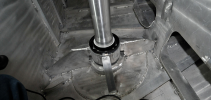 The Jefa rudder bearings are the first manufactured component to be installed on the boat. Made in Denmark, the bearings consist of a 115mm diameter double roller assembly housed in a spherical nylon swivel, all set in a very stout turned aluminum housing. The swivel allows up to 8˚ of rudder shaft misalignment, which makes installation easier and, more important , allows the bearing to turn if the shaft gets slightly bent in a collision or grounding. The thought of the 4-1/2” (115mm) 6082 alloy shaft being bent is hard to imagine, but, with a 34,000 lb displacement, huge forces could be generated. The 6082, by the way, has higher tensile and shear numbers than 5086, nearly as high as 6061, but with better corrosion resistance. Aluminum of this type is actually superior to stainless, of equivalent weight, due to it’s more elastic nature. And stainless wouldn’t work anyway in this type of rudder blade fabrication due to galvanic issues.