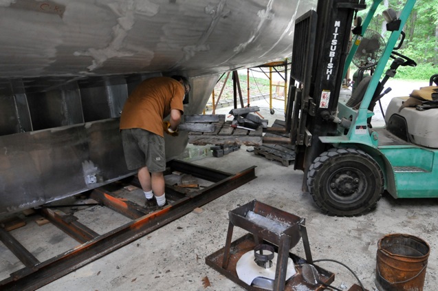 I ladled the lead for about 30 minutes at a spell, having to stop due to the heat, both in my body and which built up in the keel. Mustn’t overheat the aluminum! Occasionally I sprayed water from the hose onto the outside of the keel skin.