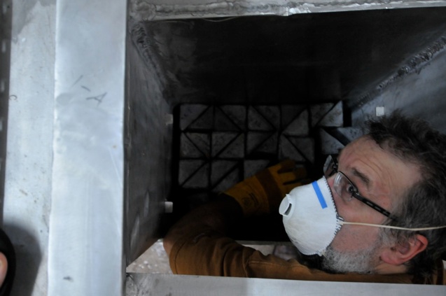 Remember that 4th blog entry, Casting Lead Ingots, from May 29, 2009? Most of those ingots were cast way back in the winter of 2009. That was the first task I did on the boat, before I even had the aluminum. Now, more than 2 years later, 2500 hours, it is time to place that lead into the bottom of the keel and seal it up forever more. The basic idea is to stand on end the 3 x16” triangular ingots, each weighing around 33 lbs, packing them as closely as possible into a giant’s tetris game, then pour molten lead around them to fill in the spaces and hold them all together.