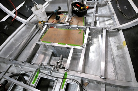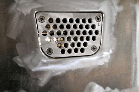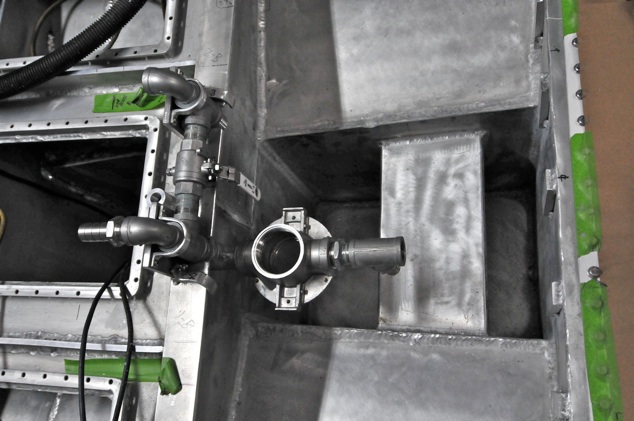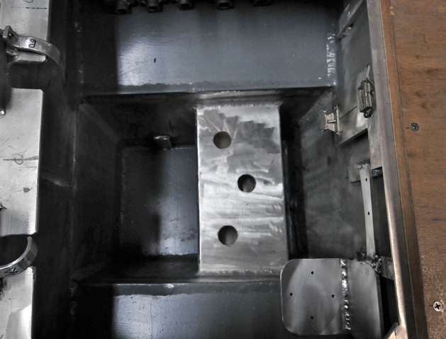 The grate is held in place with four 5/16x 1” flat head 316 ss machine screws, with Helicoils on the female threads. I will also coat these screws thoroughly with TefGel before final assembly to insure that they can be removed later for maintenance.