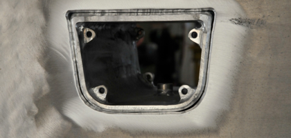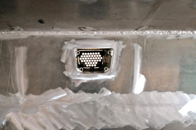 The holes for the seacocks were positioned and drilled with a holesaw and then finished with a die grinder. The bilge sump was painted with petit EZ Bilge to protect the aluminum from stray bits of dissimilar metals.