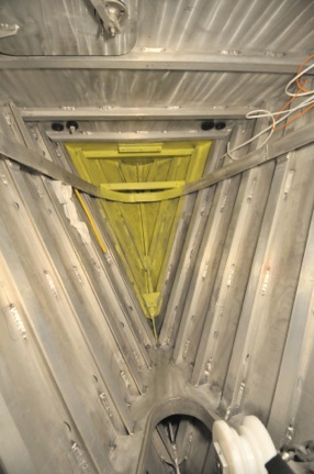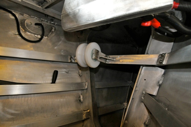 Now the issue was getting the chain from the windlass on the deck in front of the locker hatch into the trug. Experimentation showed that my preconceived ideas about how chain moves were in need of revision. The first thought was to build a sliding board with a surface of slippery UHMW plastic. But getting the fall into the trug  high enough meant that the slide didn’t have enough down  angle for the chain to move, plus the friction  was high. To reduce the friction I  decided to that rollers might be better, and since I had made a spare anchor roller, I  quickly built a bracket and began more experiments, again thinking that there need to be some initial fall from the windlass and then a slope down to the bin. Wrong!. A second roller placed on the watertight bulkhead centered above the bin and actually higher than the forward roller turned out to do the trick. It’s the weight of chain falling vertically into the bin that keeps it all in tension, so the initial fall from the windlass doesn’t need to be far.
