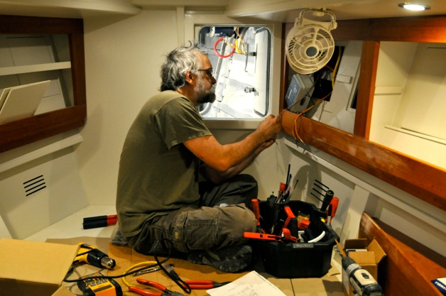 The Dix 43 has a roomy anchor locker / forepeak. Robert at Alumar suggested during our refinement of his cutting files that the watertight bulkhead be moved after by about 8”, which we agreed to. This turned out to be a very useful bit of extra room as it makes the locker much more user friendly.
