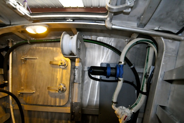 The aft roller is mounted to the angles which reinforce the WTBH. And then there’s the plumbing: Just aft of the WTBH is the gray water tank. I have plumbed a Whale diaphragm pump to allow it to pump the gray water tank overboard (in areas that allow this) or, with the correct valve selection, to allow it to act as a bilge pump and clear the water from below the chain bin. Additionally there is a deck fitting that will allow suctioning the grey water at the pumpout dock. The plumbing took as long to do as the chain handling system.