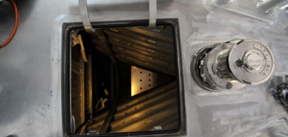 The chain runs aft across the hatch opening, which was troubling. However It is very easy to simple pull the chain to the side where a simple hook will hold it in place. We’ll just have to remember to unhook it before deploying the anchor. The UHMW rollers will fit the bow roller assembly should the need arise.