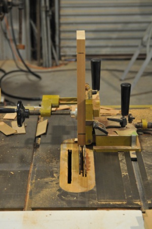 Next I cut the tenons, which are similar to the ones in the cabinet doors except these are shoulder tenons, with 4 cut sides. The sliding tenon jig has a micrometer, so once you shim the 2 dado saw blades to produce the correct thickness to slip into the mortise it’s just a matter of fine tuning the position of the tenon to match the slightly offset mortise. The micrometer makes it easy. Remember to keep up with the fence side. I mark a big “F” on this face. Yes, there are other ways to do all of this, and my way involves the tools I have acquired over the years.Your way will likewise use your tools and skill set, both can be upgraded!