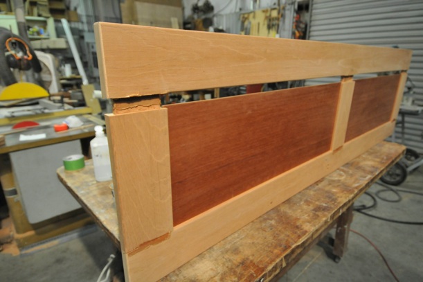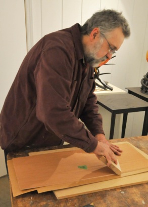 The panels are 5mm plywood , veneered on both sides with paper-backed Spanish Cedar veneer and set into routed grooves. I really like the Titan water based glue, it’s very easy to use and sticks tight.I made a maple smooth block, and the picture shows me gluing up in the confines of my small gallery space-the only area of the shop could keep warm enough for the glue to set. Did I say woodworking in winter is fun? Cut the plywood to fit, then cut the veneer sheets 1-2” oversize, glue, dry , then trim with razor knife. Sand a slight bevel onto the edges to keep the veneer getting caught on the groove when assembling. I then prime the panels with the thin epoxy Smith’s CPES before assembly.