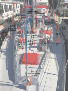 We began the process then of measuring for the main and the jib.We have 36” high lifelines to clear, plus the mast pulpits, plus the inner forestay. A 150% heavy genoa did not make sense, so in discussion with Jamie and Phil we opted for a 110% genoa (which is just barely a genoa, I suppose, more of a jib).The clew would be high enough to clear, but not extreme like a Yankee, which loses too much area. The measurement job was very thorough, with lots of cross checks.