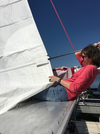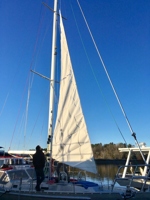 About 3 weeks after the order was placed the sails arrived in 2 huge boxes via air express, weighing each about 45 kg. That weekend John and Ken, neighbors from down the dock, helped us wrestle the genoa onto the foredeck and we hoisted it easily up the furler. A gentle wind stirred it fitfully to and fro, a thoroughbred waiting for the gate to open.