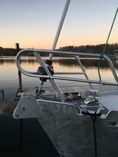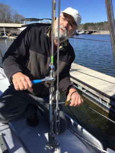 The shrouds had previously only been tightened “hand-tight”. Rig adjustment is a bit of a black art. Finally I found a book with some hard data written by a Norwegian sailor. The cap shrouds should be tightened to 15% of breaking laod. It is a feature of 1x19 316ss wire that a 3mm elongation measured over a 2 meter length equals 15% of BL. We taped a 6’ folding ruler to the shroud, marked it’s lower end and then tightened away on the turnbuckle. It didn’t actually take too many turns to achieve the target. The backstays were also adjusted in this manner, then the remainder of the shrouds tightened in a manner to straighten the mast column (black art, see?). Ultimately we will examine the shrouds and mast while underway to see if the leeward ones are too slack while beating, but for now we have some tension and the mast is (mostly) straight with a wee back of back bend a about 2˚ of rake.