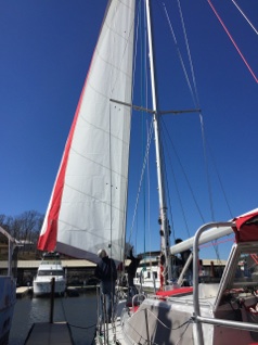 The main was somewhat simpler to measure and we deferred to the sailmakers as to most of the details-they know what they are doing. It is a full batten main, with 3 reefs. Each reef tack has a web and ring “dogbone” for hooking onto the tack horn. It is traditional slab reefing. Zoom’s method of corner reinforcement is a radial star pattern which orients the bias of the fabric in line with the highest loads. We opted for Dimension Polyant AP fabric which they( Jamie and Phil) have tested in the tropics as having much better longevity than Marblehead. It is a bit stiffer and about 10% more expensive (for the material). We also ordered a stack pack type sailcover in , of course, red Sunbrella.
